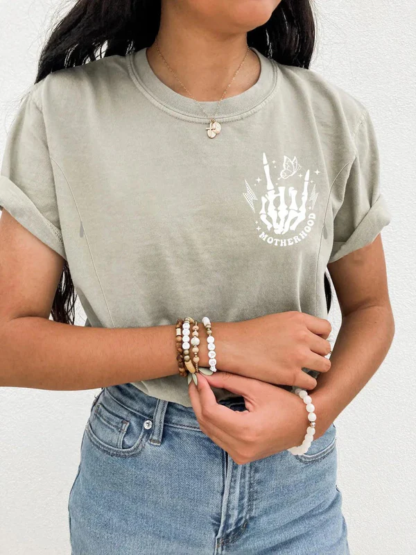 Note: The tee is a regular fit, and we recommend you to choose one to two size up when pregnant. If you prefer a relaxed fit, size up. If you're between sizes, please size up.